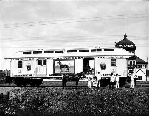 Dan traveled in a special car, gaily decorated with pictures of the great horse—trips were made throughout the United States. Dan went lame after an exhibition mile at Los Angeles in 1909 and was retired the following year.